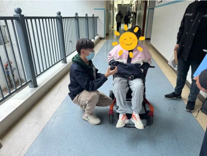 在现场,小曹通过站立架的辅助慢慢地站了起来,那一刻,小曹脸上洋溢出来的喜悦,无不让在场的家人和工作人员恻隐动容。工作人员为小曹调试好智能轮椅,在家人的陪伴和工作人员的全程指导下,小曹驾驶着智能轮椅从家来到了学校。