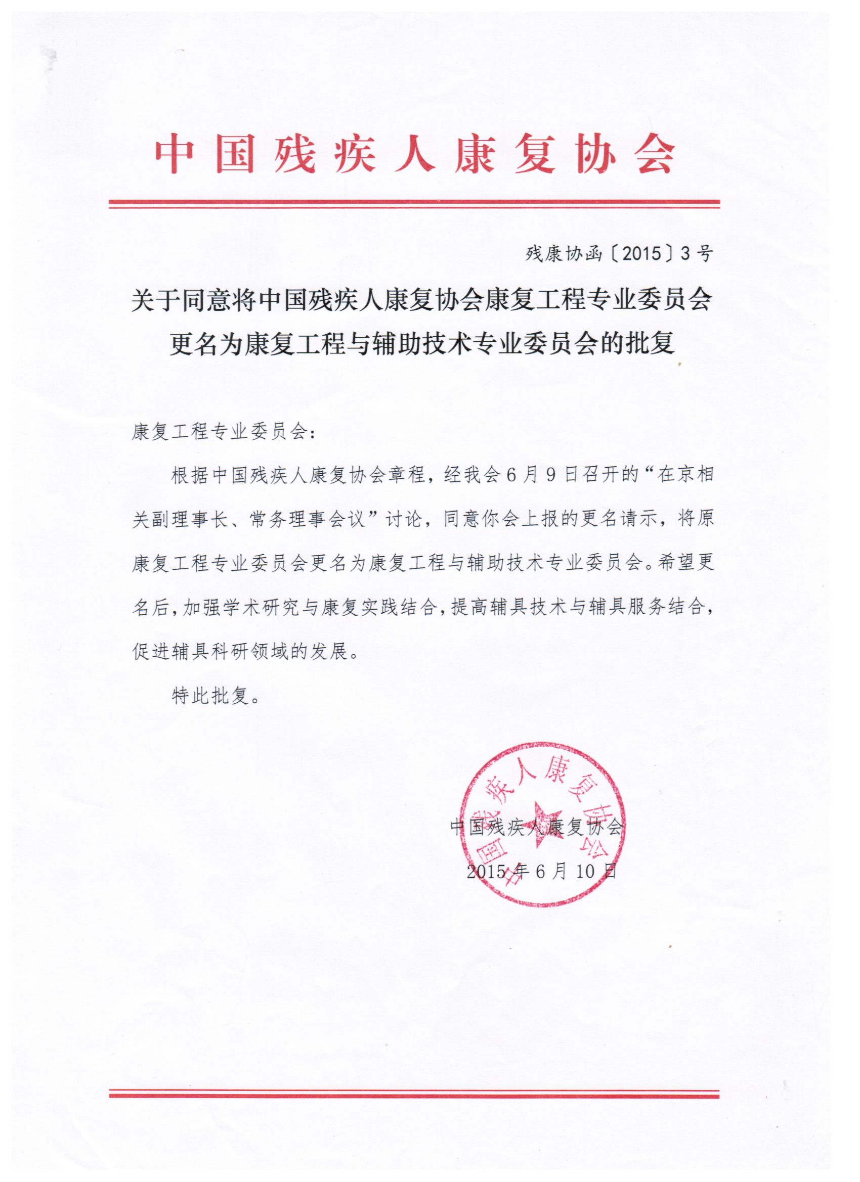 关于同意将中国残疾人康复协会康复工程专业委员会更名为康复工程与辅助技术专业委员会...