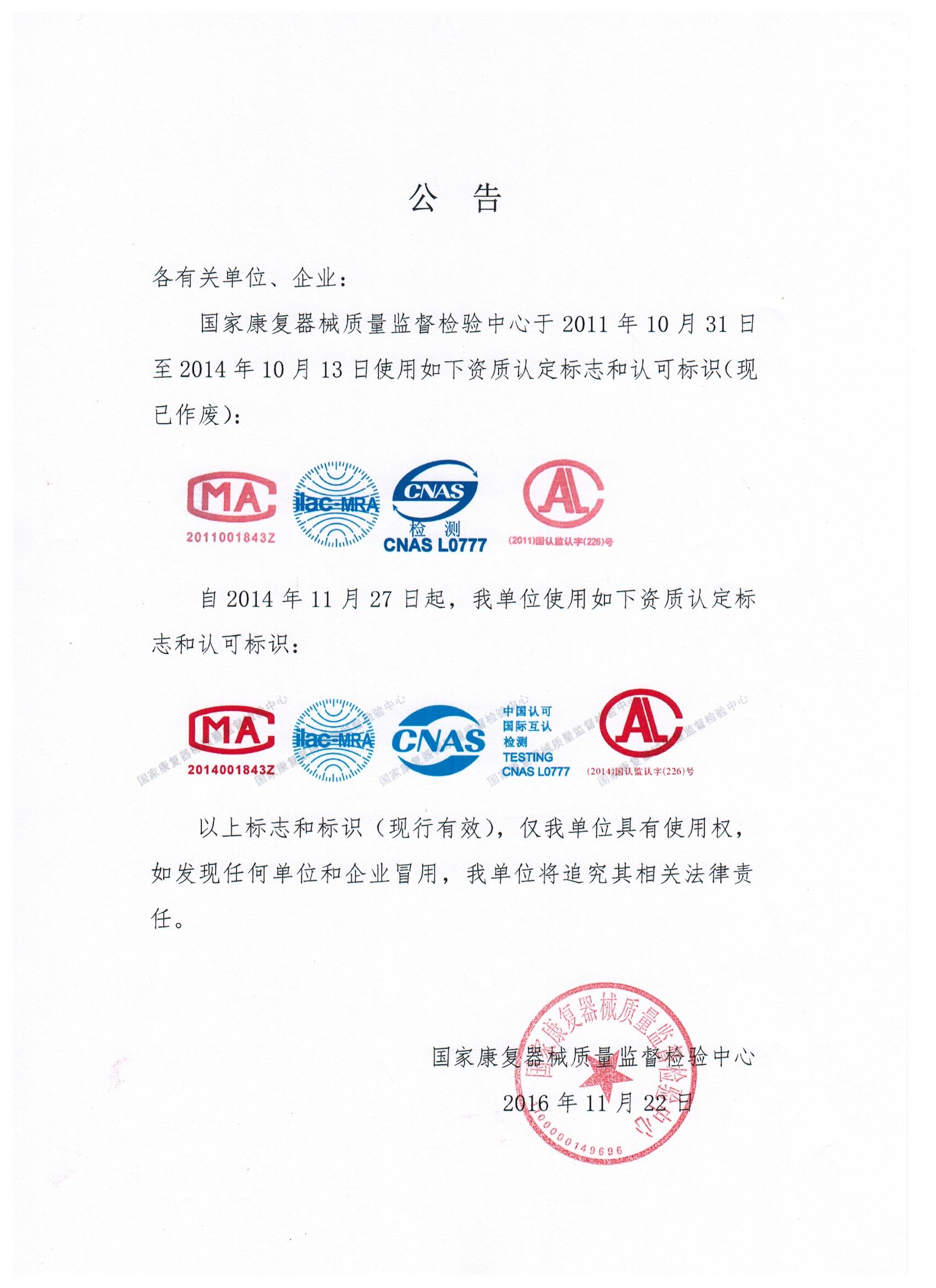 关于国家康复器械质量监督检验中心资质认定标志和认可标识的公告