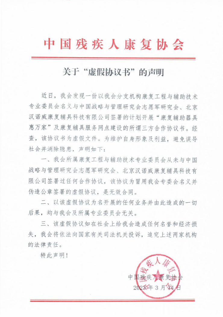 一、我会所属康复工程与辅助技术专业委员会从未与中国战略与管理研究会志愿军研究会、北京汉诺威康复辅具科技有限公司签署过任何合作协议,该协议为冒用我会专委会名义并伪造公章签署的虚假协议,是无效合同。