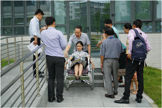 图为学员现场进行轮椅上下台阶的训练