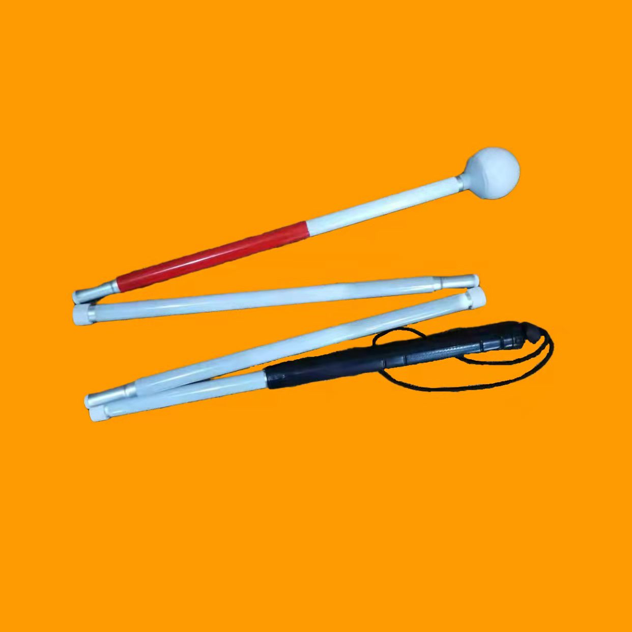 1)手柄结构设计适合盲杖使用中多种正确握持,手柄上端装有弹性腕带,不易从手中滑落 2)折叠连接部件连接牢固,具有防松动装置