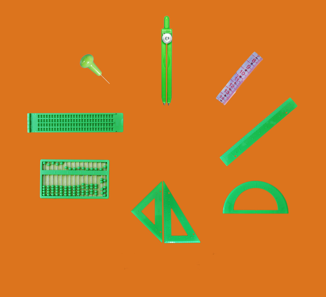 2.产品组成:量角器、圆规、直尺、算盘、30度三角尺、等边三角尺、盲人刻字板、盲笔、卷尺