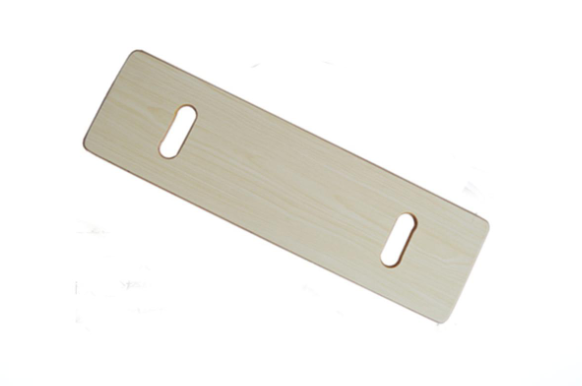 1、医护人员或者亲属紧握移乘板手孔柄,将前端放入患者臀下,后端平放于所要移至的器具上。确认器具牢固、稳定后,使患者呈坐姿,臀部在移乘板上滑移。