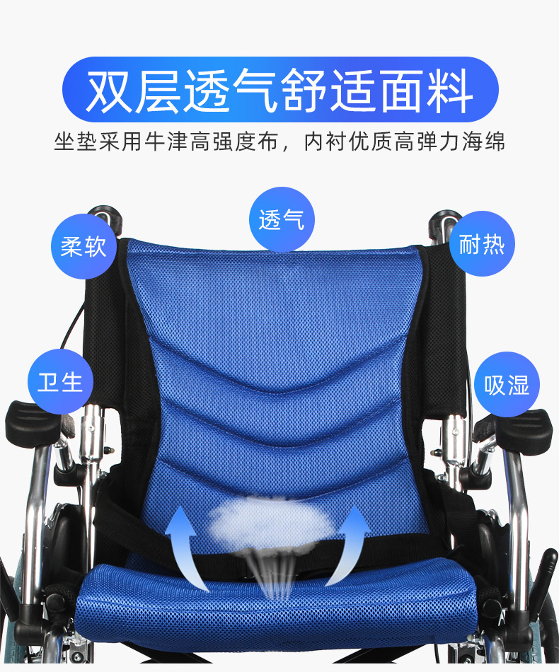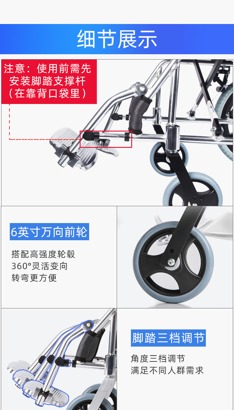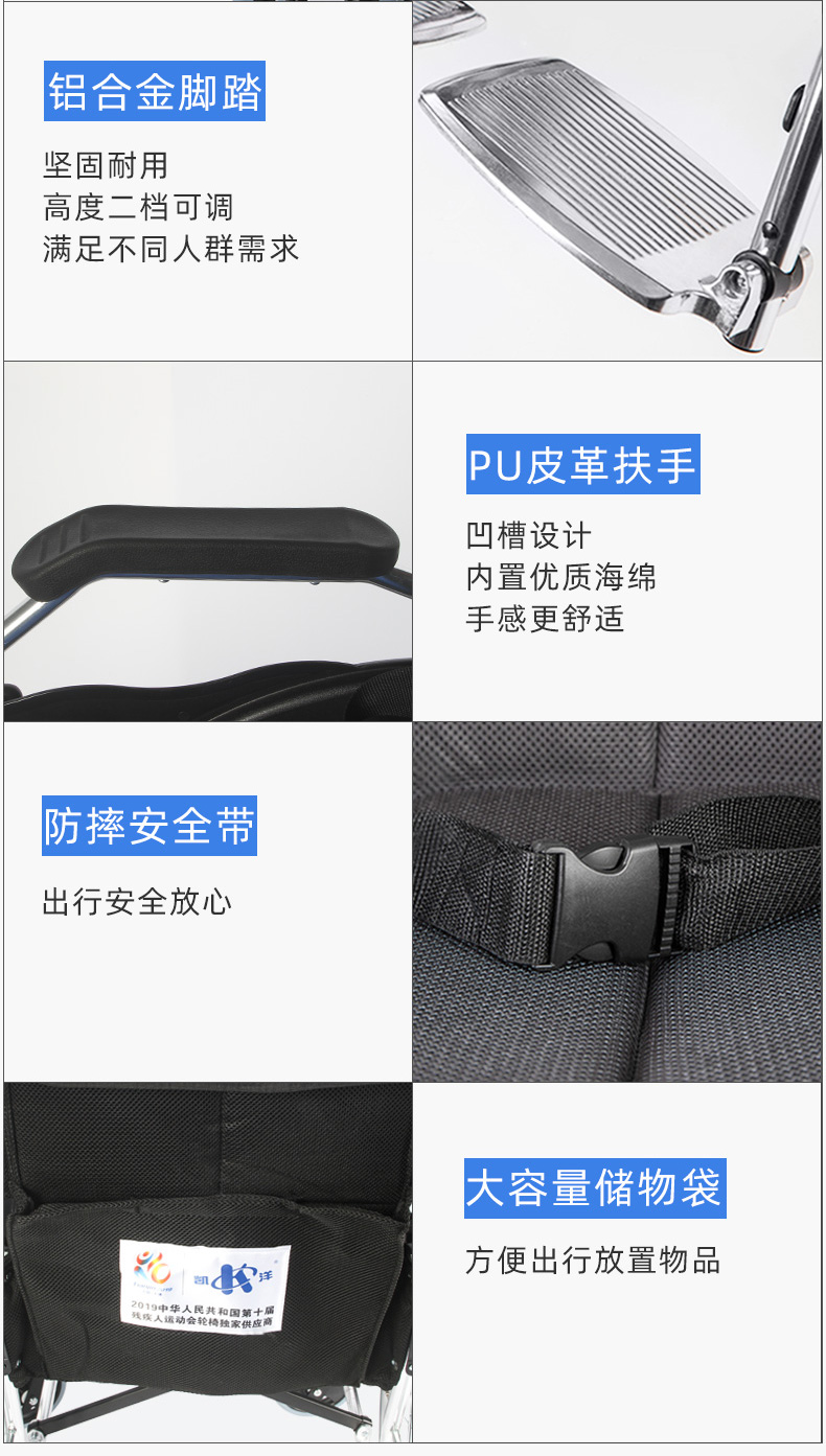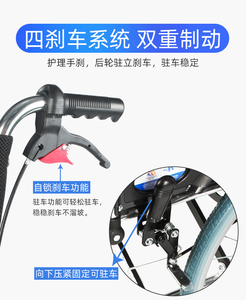 4、安全装置:采用肘节式刹车,刹车装置制动后低于座位面,方便快捷、安全 ,后把手处具有连刹功能,能让看护者随时刹车,既快捷又安全。