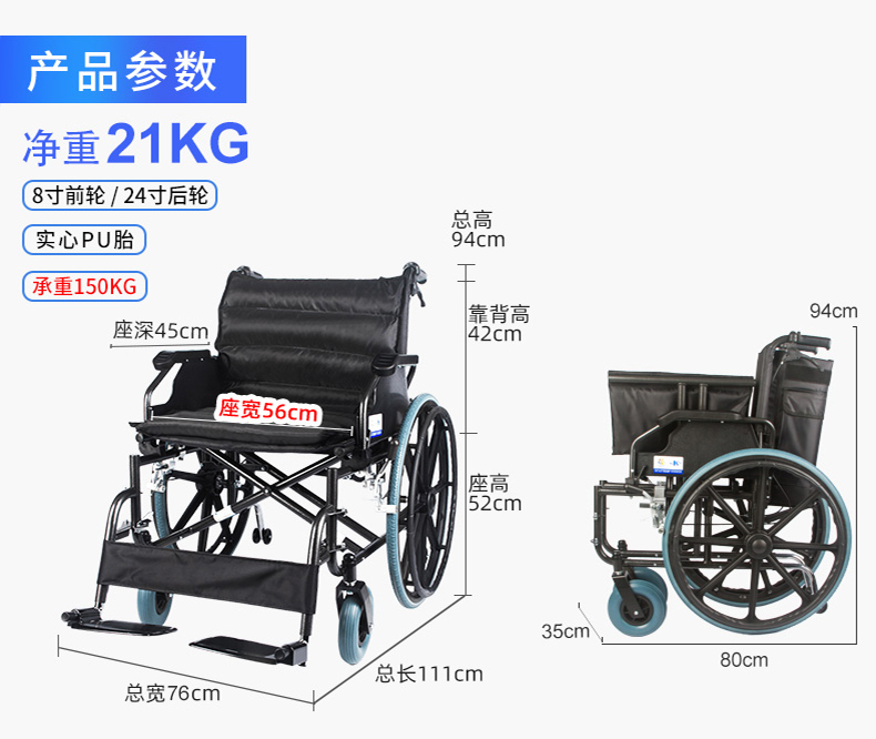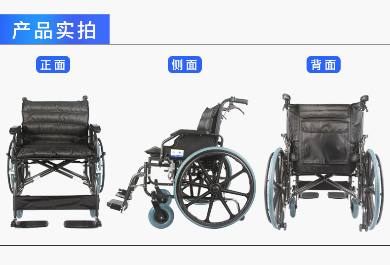 9、后轮:24英寸(61cm)实心胎后轮,具有免充气,耐磨系数高的特质,配手轮装置(手直接驱动轮椅时使用)