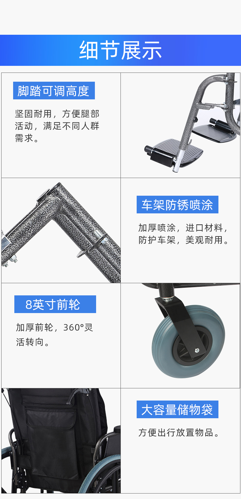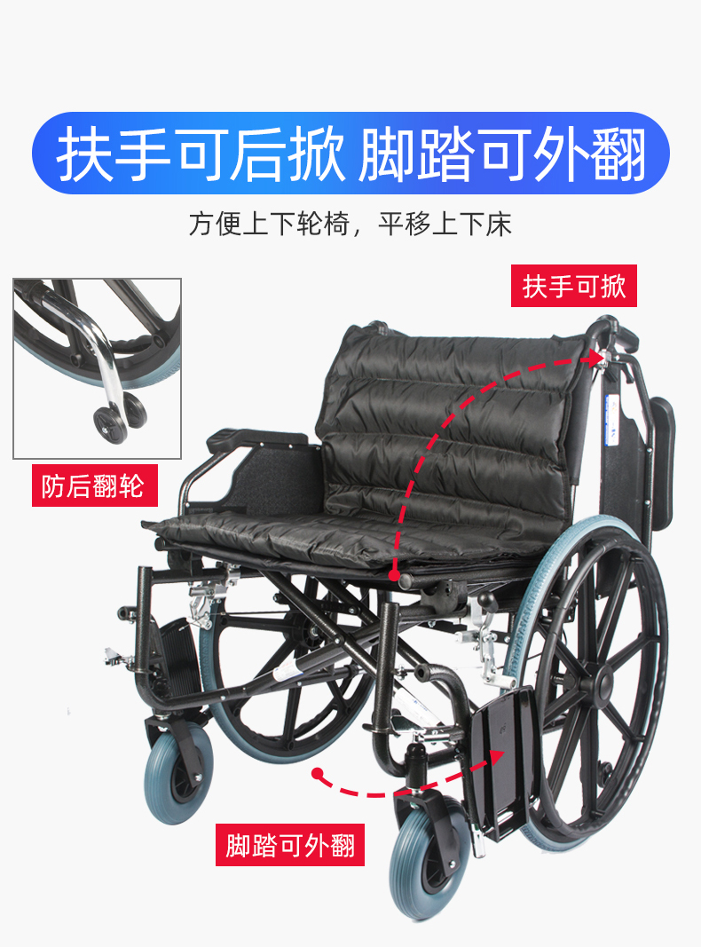 3、可后翻扶手、可拆卸脚托方便使用者从侧面上下轮椅。