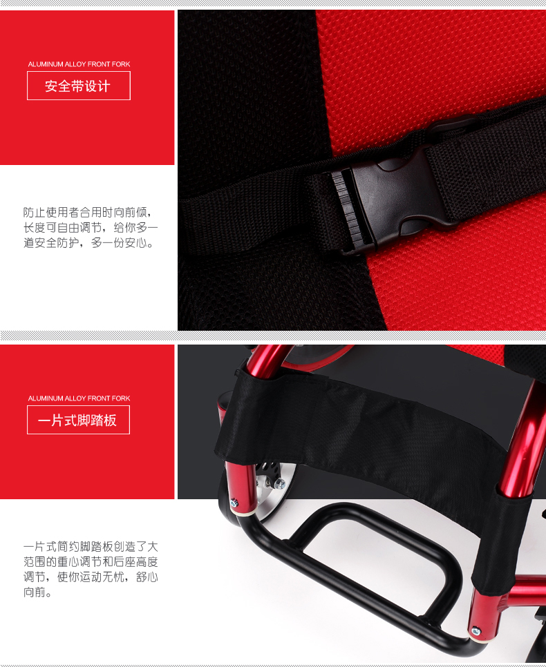 1、铝合金氧化车架不仅轻便美观、还具有不退色、防锈能力强。可折叠结构,安全性能高,