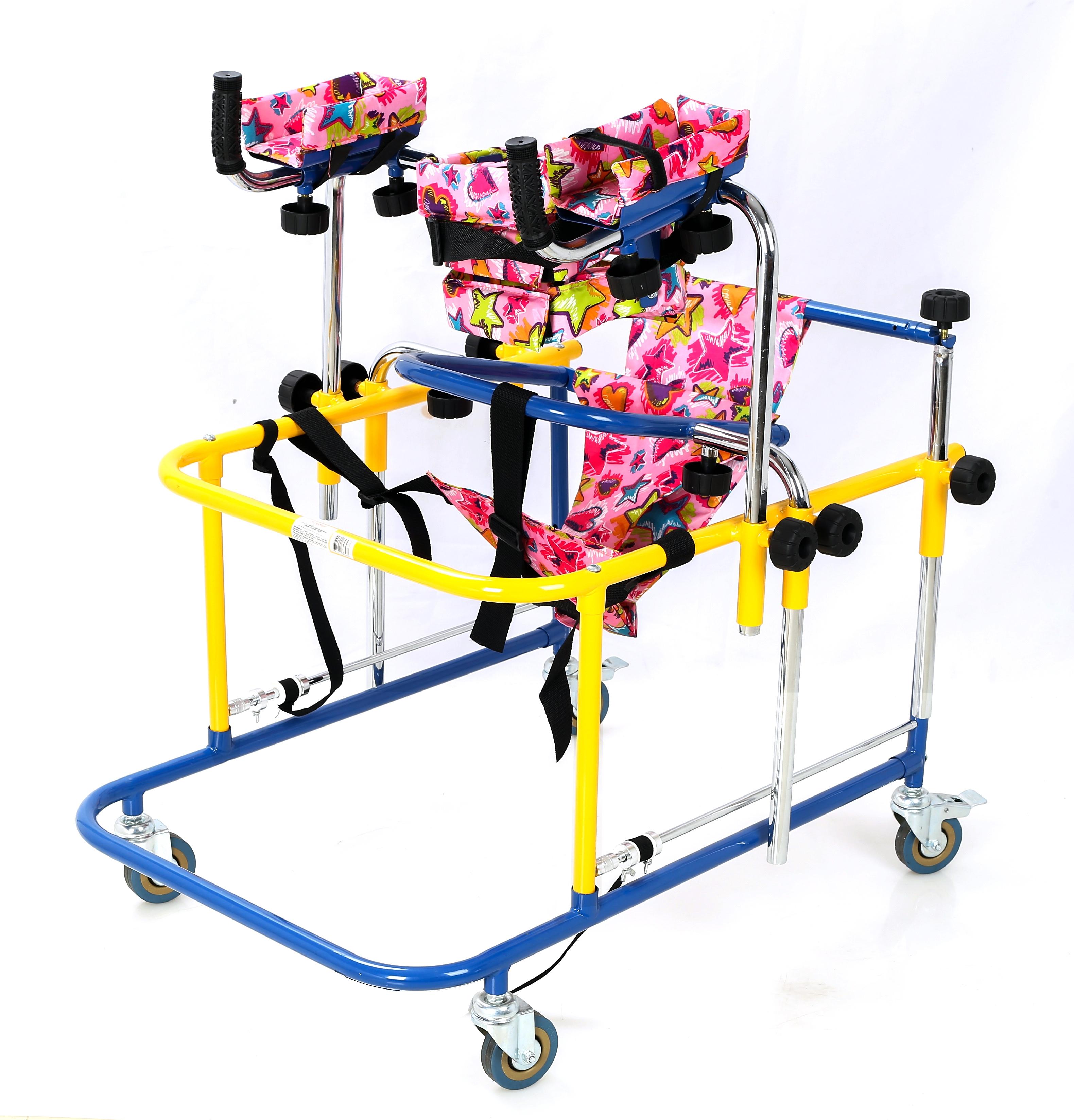 车架:高靠背可平躺,半包围头枕能起到很好的固定作用,采用直径25.4*2.0厚的铝合金管焊接而成,表面喷塑,后躺角度无级可调,扶手可随靠背后躺角度自动升降移动,安全、牢固;更适合脑瘫儿童使用;