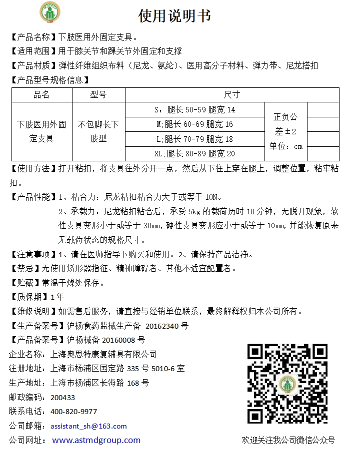 奥思特 J下肢医用外固定支具 不包脚长下肢型:S、M、L、XL
