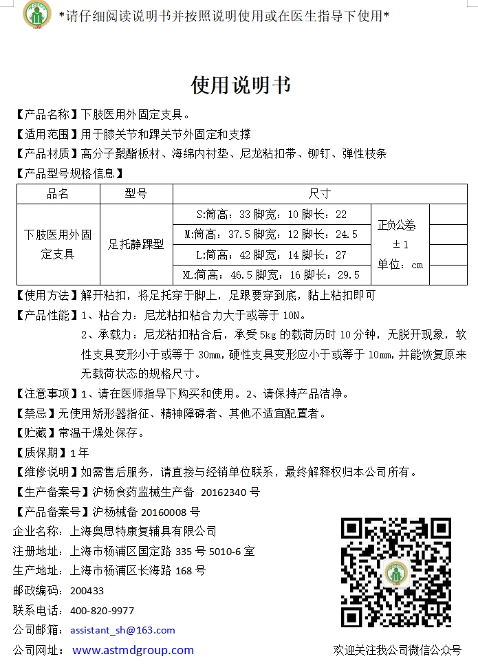 奥思特 J下肢医用外固定支具 足托静踝型:S、M、L、XL