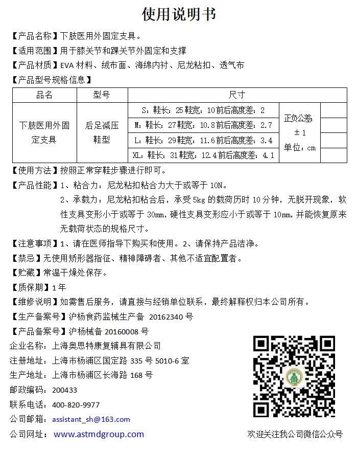 奥思特 J下肢医用外固定支具 后足减压鞋型:S、M、L、XL