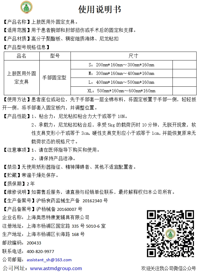 奥思特 上肢医用外固定支具 手部固定型:S、M、L、XL
