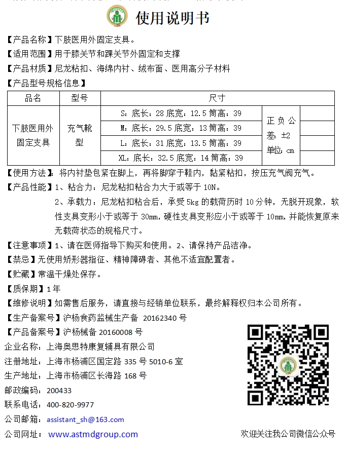 奥思特 J下肢医用外固定支具 充气靴型:S、M、L、XL