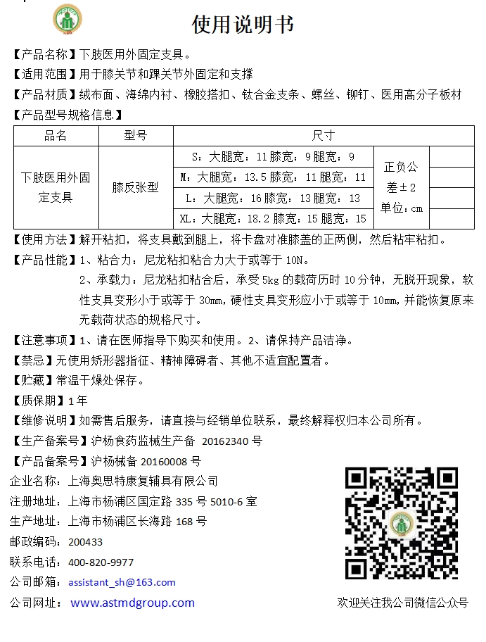 奥思特 J下肢医用外固定支具 膝反张型:S、M、L、XL
