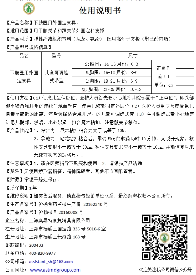 奥思特 J下肢医用外固定支具 儿童可调蛙式带:S、M、L、XL