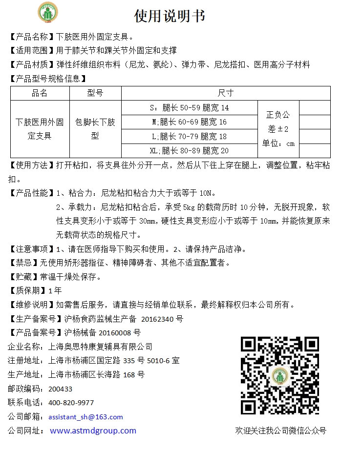 奥思特 J下肢医用外固定支具 包脚长下肢型:S、M、L、XL