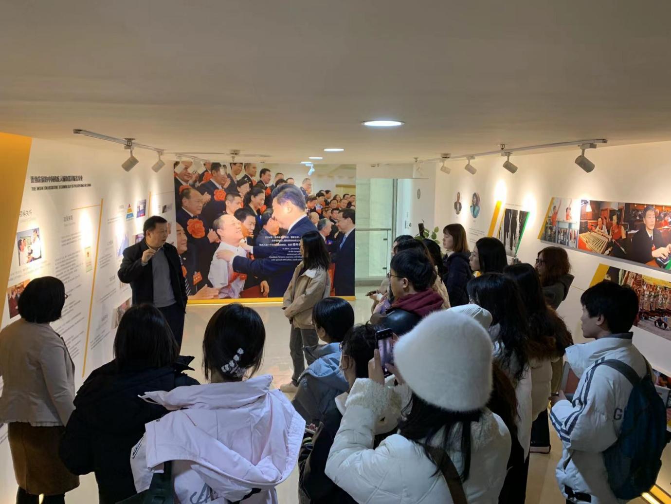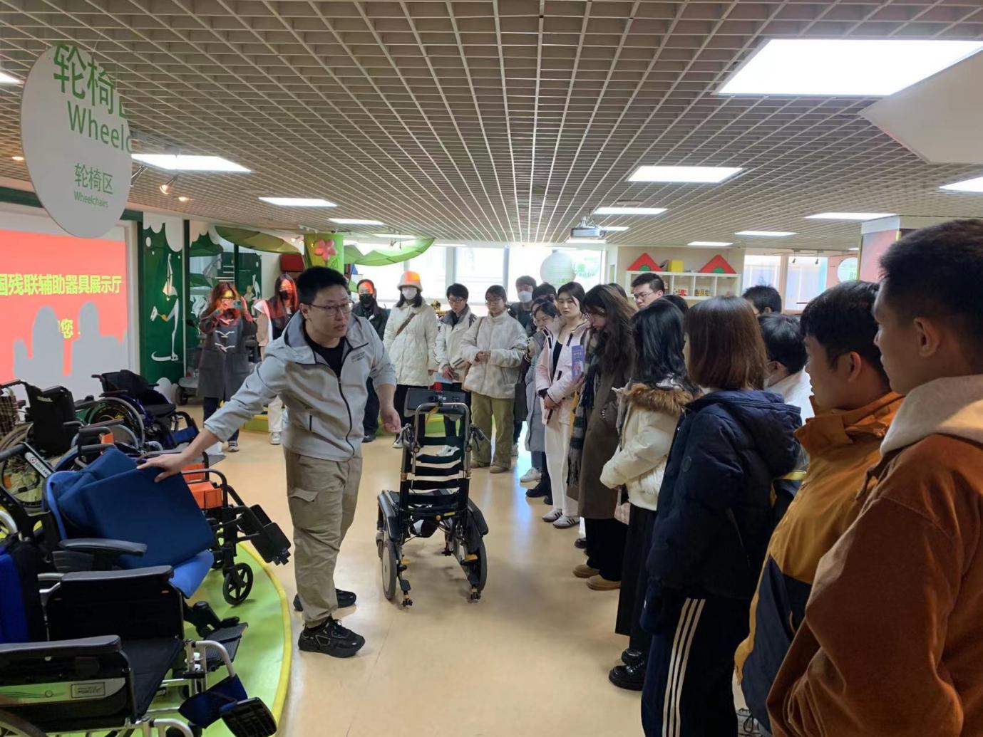 图为师生参观辅具展厅并互动体验