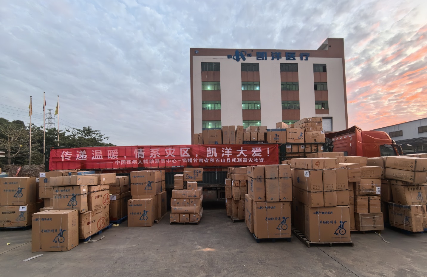 中国残疾人辅助器具中心爱心倡议得到行业内爱心企业积极响应。佛山凯洋医疗器械有限公司、佛山市东方医疗设备厂有限公司、天津市泰斯特仪器有限公司、广东大洋医疗科技股份有限公司4家企业慷慨解囊,捐赠价值79万元轮椅、手杖、腋拐等灾区急需的3400余件辅助器具产品,并按照救灾工作统一要求迅速运抵积石山县,帮助受灾残疾群众及时得到救助。