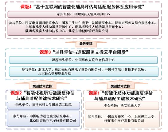 本项目分为“智能化肢体功能康复评估与辅具适配关键技术研究”、“智能化视听功能 障碍评估与辅具适配关键技术研究”、“辅具评估与适配服务支撑云平台研发”、“基于互 联网的智能化辅具评估与适配服务体系应用示范”四个课题。项目参与单位有:中国残疾人 联合会信息中心、中国康复研究中心、中国听力语言康复中心、国家康复辅具研究中心、国 家卫生健康委卫生发展研究中心、中国科学院计算技术研究所、浙江大学、西安交通大学、 上海理工大学、福建医科大学附属第二医院、北京社会管理职业学院(民政部培训中心)、 浙江福祉有助电子商务有限公司、北京国宏康医疗电子仪器有限公司、北京主动健康管理公 司、浙江聚仁医疗科技有限公司、深圳市残疾人综合服务中心、上海市残疾人辅助器具资源中心、湖北省残疾人辅助器具资源中心、陕西省辅助技术中心。