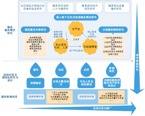 本课题通过开展辅具连续服务模式研究,对整个服务体系的优化建设提供必要的支撑;对基于互联网的辅具评估与适配服务支撑云平台和各功能模块及数据库形成的远程、移动、智能一体化融合的评估 - 适配 - 训练 - 跟踪的闭环连续服务系统进行应用示范研究,至少 在全国 4 个省市 30 个区县开展基于互联网的辅具评估与适配服务体 500 系应用示范,建立 规范化示范点 60 个,面向城市、农村和贫困地区为超过 1 万名功能障碍者提供应用示范服务, 总结制定辅具适配服务规范 1 套,并进行成本效益研究,开展国际交流,在取得成功的基础上, 为向其他省市和地区进行推广奠定基础。